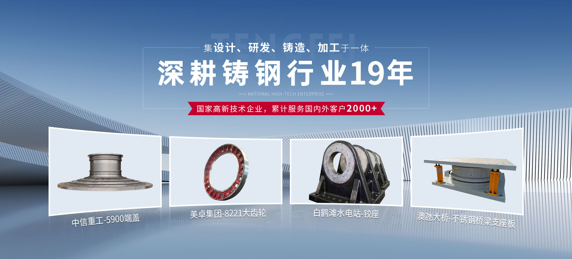 騰飛鑄鋼成立于2006年,位于全國鑄造基地河南省新鄉(xiāng)市,擁有員工300余人,是一家從事150噸以下碳鋼、低合金鋼、不銹鋼鑄鋼件研發(fā)、制造、服務(wù)為一體的國家高新技術(shù)企業(yè)?! 」就ㄟ^了ISO9001國際質(zhì)量管理體系認(rèn)證,擁有2項發(fā)明專 利,2項河南省科技成果、25項實用新型技術(shù),通過了“環(huán)??冃гu級B級企業(yè)”驗收,先后榮獲“河南省鑄造行業(yè)綠色發(fā)展企業(yè)”、 “河南省科技型中小企業(yè)”、“河南省專精特新中小企業(yè)”等榮譽稱號?! 」緭碛?臺25噸電爐,4臺大型天燃?xì)鉄崽幚頎t、10米回旋自動拋丸機一臺, φ8m數(shù)控立車、φ10m數(shù)控滾齒機等各類高精裝備100余臺套,年產(chǎn)能3萬余噸,能為客戶提供從產(chǎn)品設(shè)計、木模加工、大型鑄造、大型加工一站式服務(wù),產(chǎn)品廣泛應(yīng)用于建材、冶金、鍛壓、冶金、水工、路橋、化工等多個重型行業(yè)?! ¢L期服務(wù)于中信重工、中船重工、美卓、上海中交、萊歇、寶武、濟南重工等全球知名企業(yè),在行業(yè)內(nèi)擁有較高的市場知名度和美譽度。